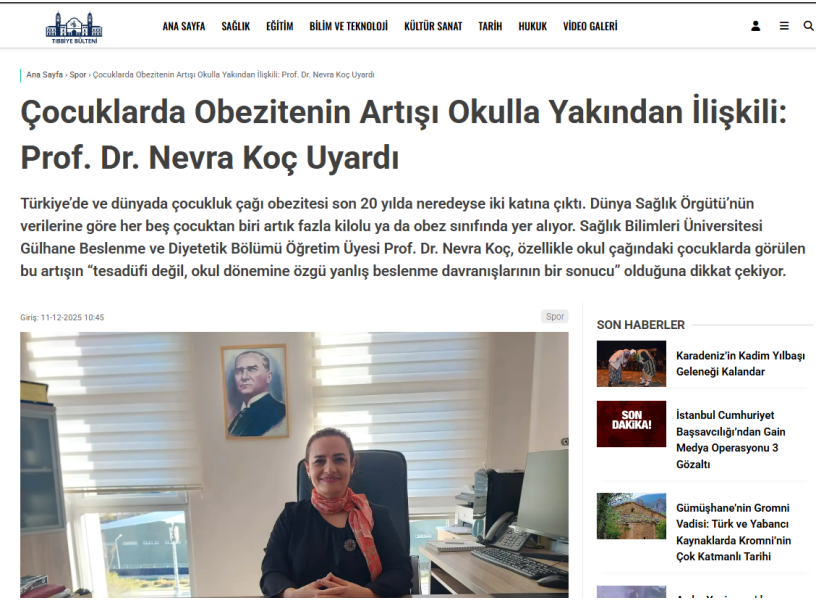 Sağlık Bilimleri Üniversitesi Gülhane Beslenme ve Diyetetik Bölümü Öğretim Üyesi Prof. Dr. Nevra Koç’un, özellikle okul çağındaki çocuklarda görülen obezitedeki artışın “tesadüfi değil, okul dönemine özgü yanlış beslenme davranışlarının bir sonucu” olduğunu belirten röportajı Tıbbiye Bülteninde yayınlanmıştır.